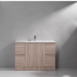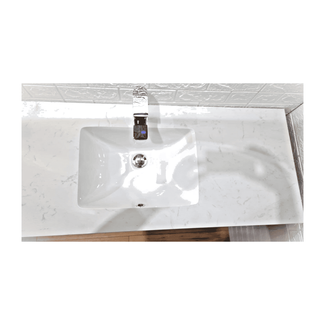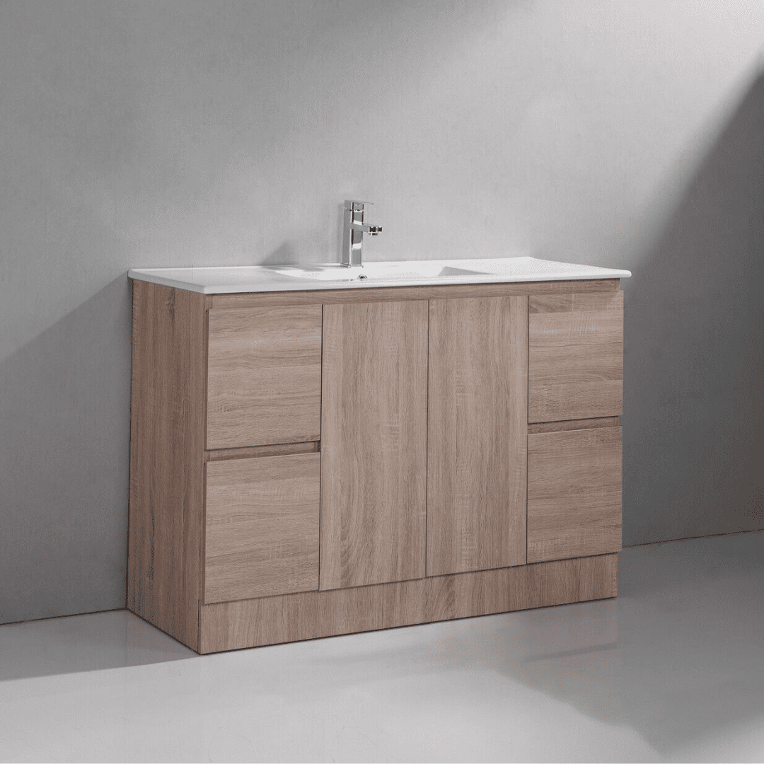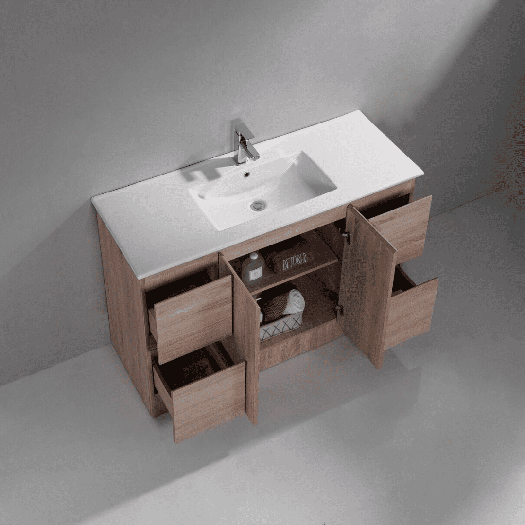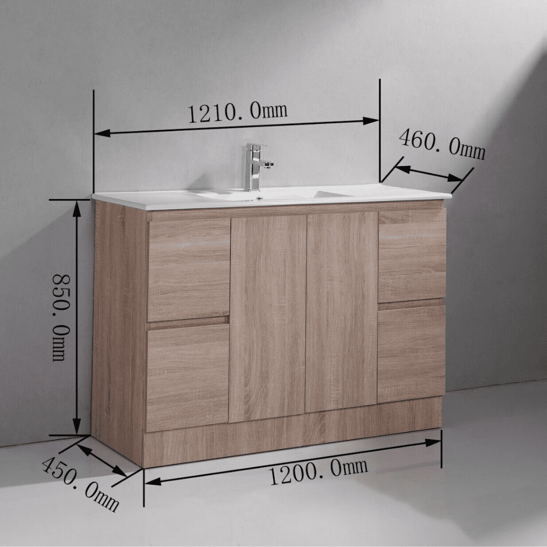 Cabinet 1200x460x850 PVC paint free cabinet 2 doors+ 4 drawers Soft/slow close 16mm counter top white1 basin in Stone cabinet in Wood color Water Proof